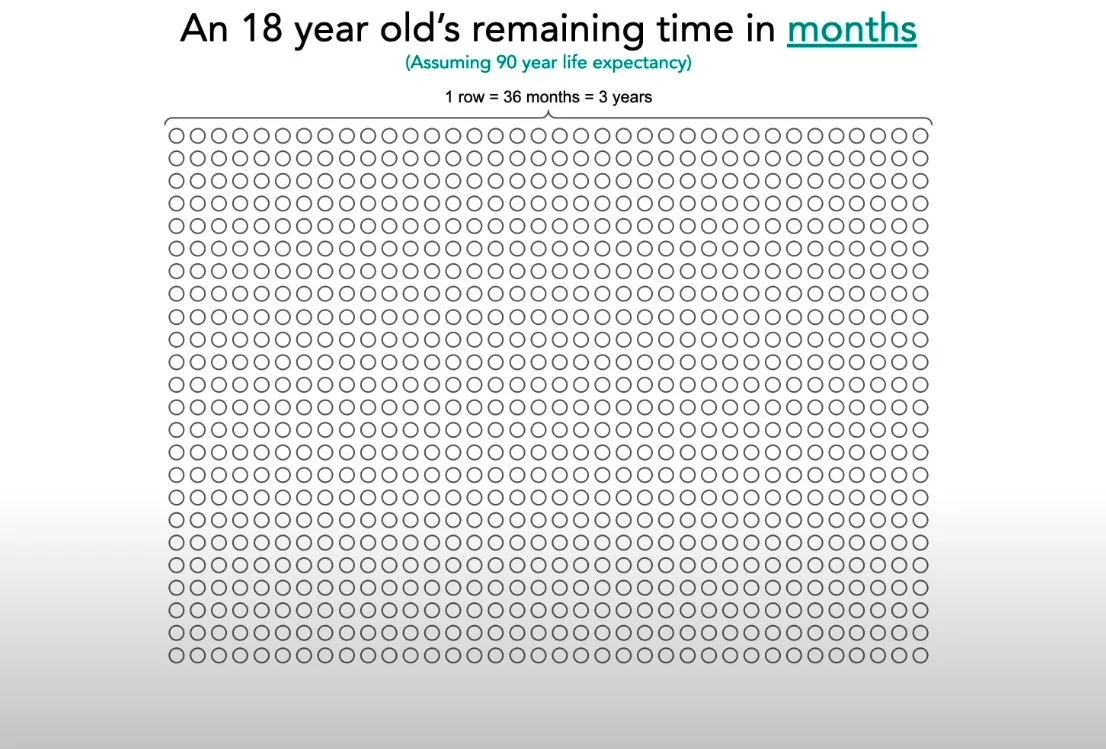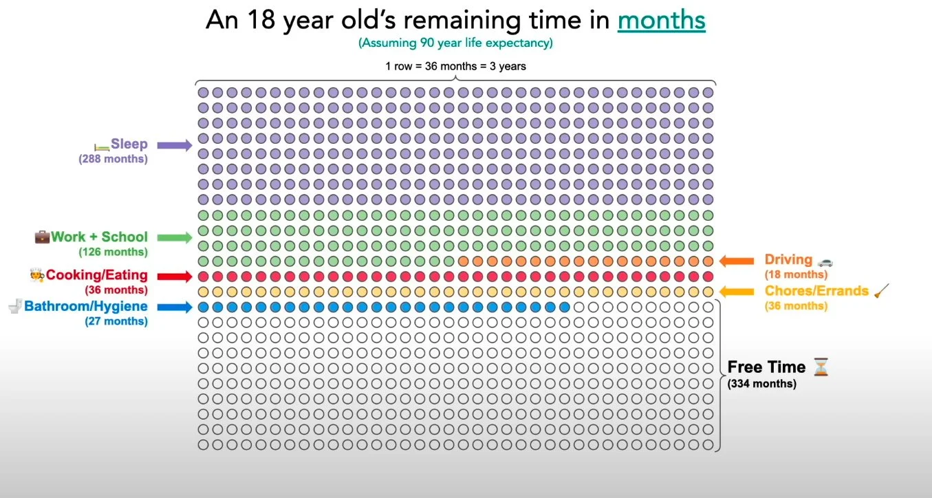 Now watch them disappear. Sleep takes 288 circles. Work swallows another 126. Eating, commuting, errands, obligations - there they go. You're left with 334 months of truly free time. Just under 28 years to live the life you actually want.